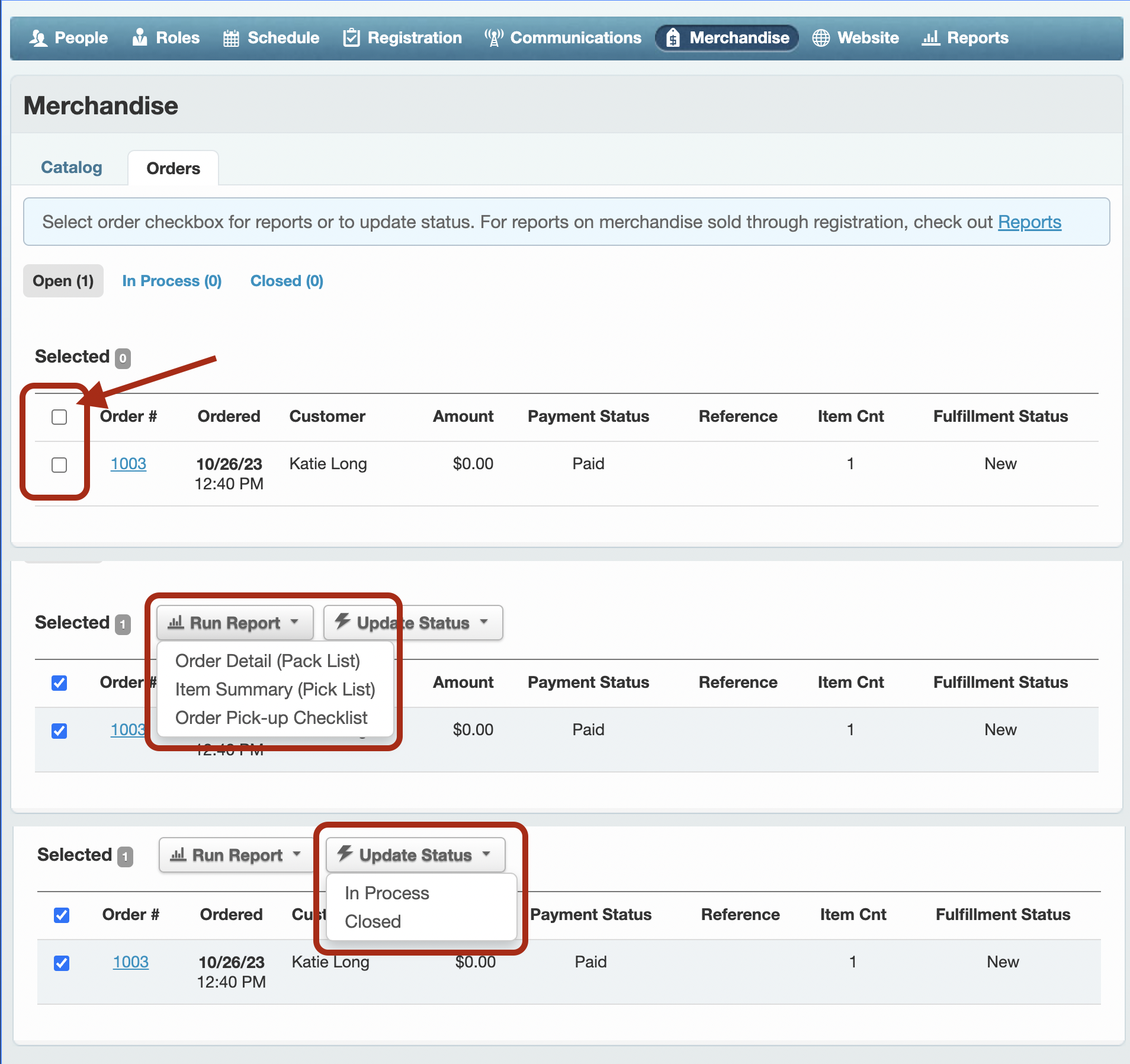 Tip: To access additional merchandise actions, use the check box to select one or multiple orders – this opens two new buttons that allow you to access additional reports or allow you to bulk update the order status.