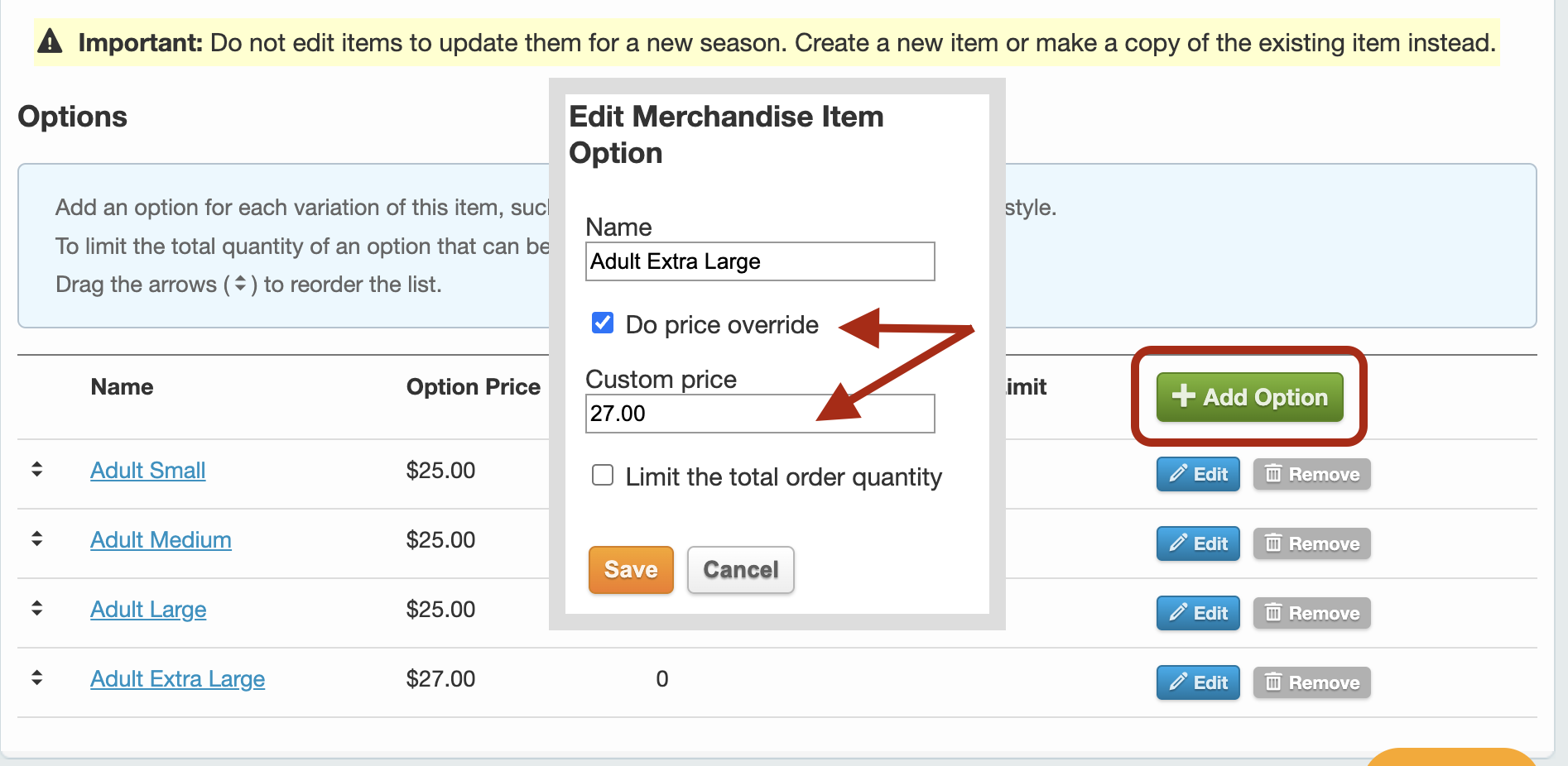 - Handling Order Limits: If your merchandise has order limits, SwimTopia counts the orders from last season as part of the cumulative quantity. Therefore, to maintain clear records and prevent over-ordering, it’s better to create new items each season.