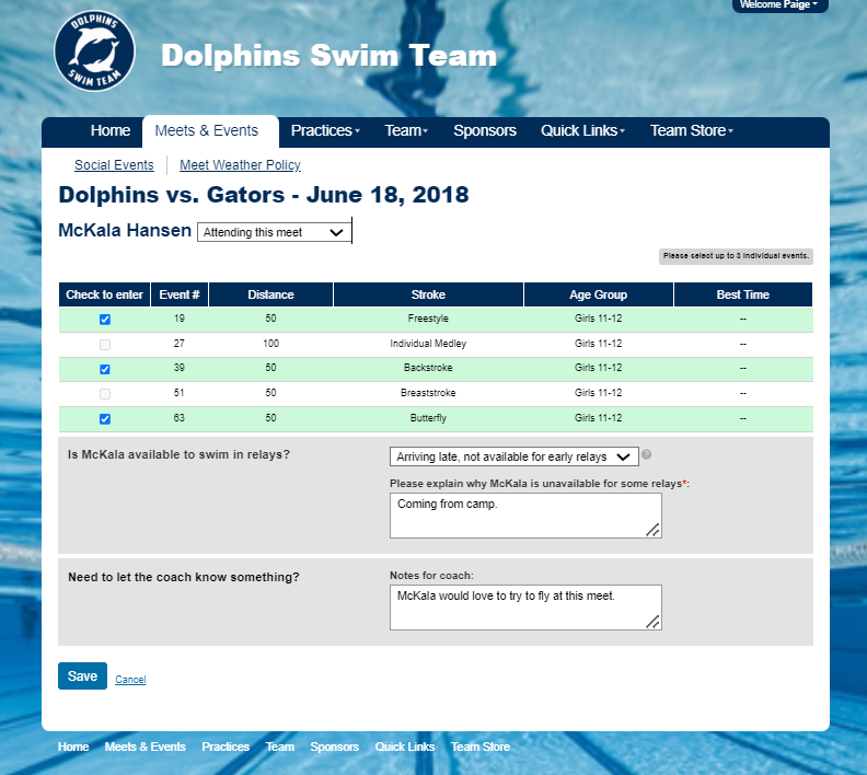 Parents and/or coaches can sign up swimmers for swim meets, with parents declaring attendance for their kid(s) to keep meets running smoothly. Coaches can quickly filter, view and edit entries and automatically generate relays with a single click.